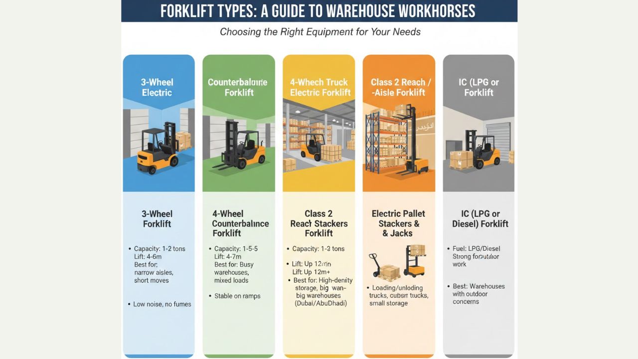UAE warehouses need compact, efficient machines for tight spaces and long hours. Here are the main types used most: